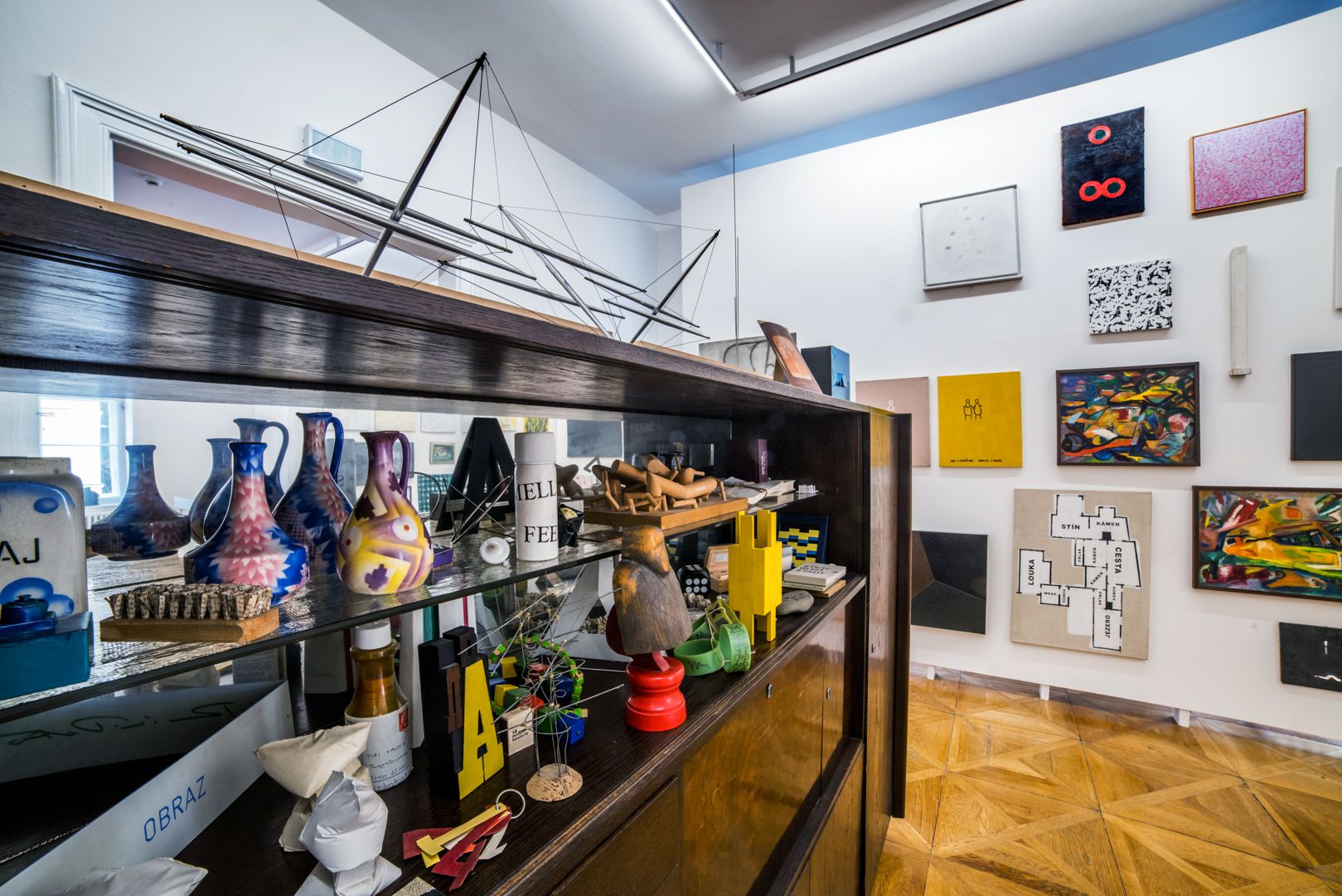 The exhibition is spread over twelve rooms on the first floor of the Pražák Palace. The dominant attraction is a room with a chute. To the exhibition room showing the work of Dalibor Chatrný visitors can slide from a re-hung permanent exhibition of Modern Art on the second floor. Other rooms present post-surrealist works, land-art realizations and geometrical abstractions. A separate room is dedicated to text installations by Jiří Valoch, which he used to place directly on the walls of galleries. Another room faithfully reconstructs the situation in his flat overflowing with art. The exhibited artists will include Milan Knížák with his post-modern furniture and collages from vinyl records. Space will also be provided for the work of Marian Palla featuring his processual paintings on display together with the photographic documentation of their origins in the studio on Kotlářská St.