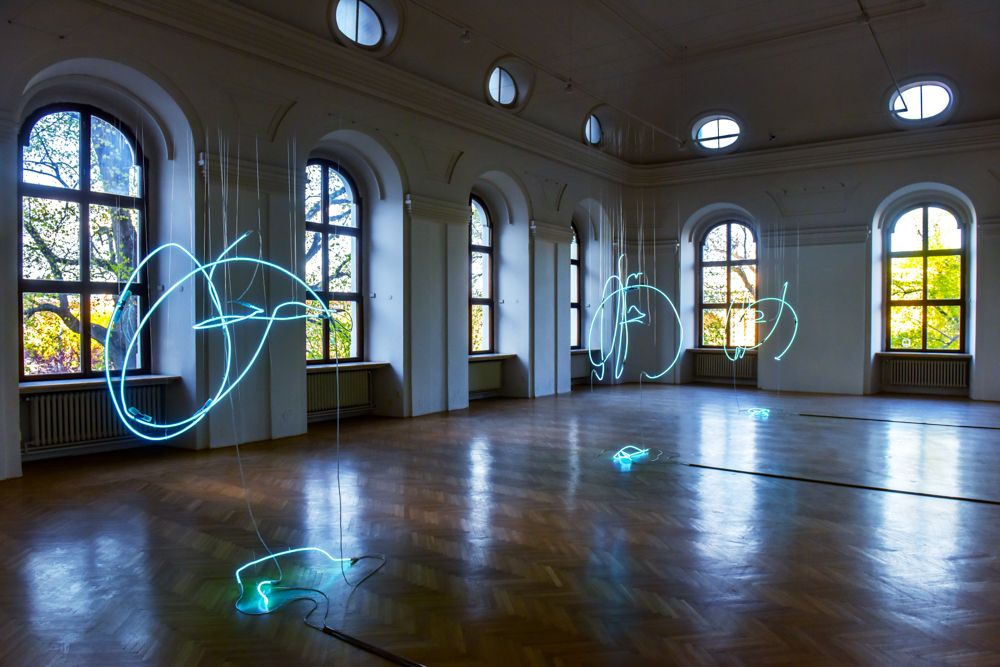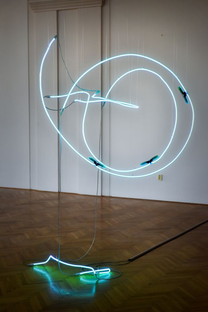 Instalace monumentálních světelných plastik Pavla Korbičky (nar. 1972) představuje výsledek projektu navazujícího na linii autorovy tvorby, v níž se zabývá hledáním různých forem záznamů efemérního tanečního pohybu. Její komplementární stránku tvoří světelné "site-specific" instalace pracující s možnostmi fyzického zakoušení a prožívání prostoru skrze světelný vjem. V ohnisku autorova dlouhodobého zájmu leží téma, které lze ve výtvarném umění považovat za jedno z klíčových, přinejmenším již od vzniku avantgardy. Je jím vztah média prostoru a času. Tradiční východisko zpřítomnění časové dimenze ve výtvarném díle představuje reálný lidský pohyb. Předobrazem Korbičkovy trojdílné světelné plastiky se staly tři časově (a tudíž i svým provedením) rozdílné záznamy identické taneční sekvence snímané pomocí reflexních bodů umístěných na těle tanečnice.